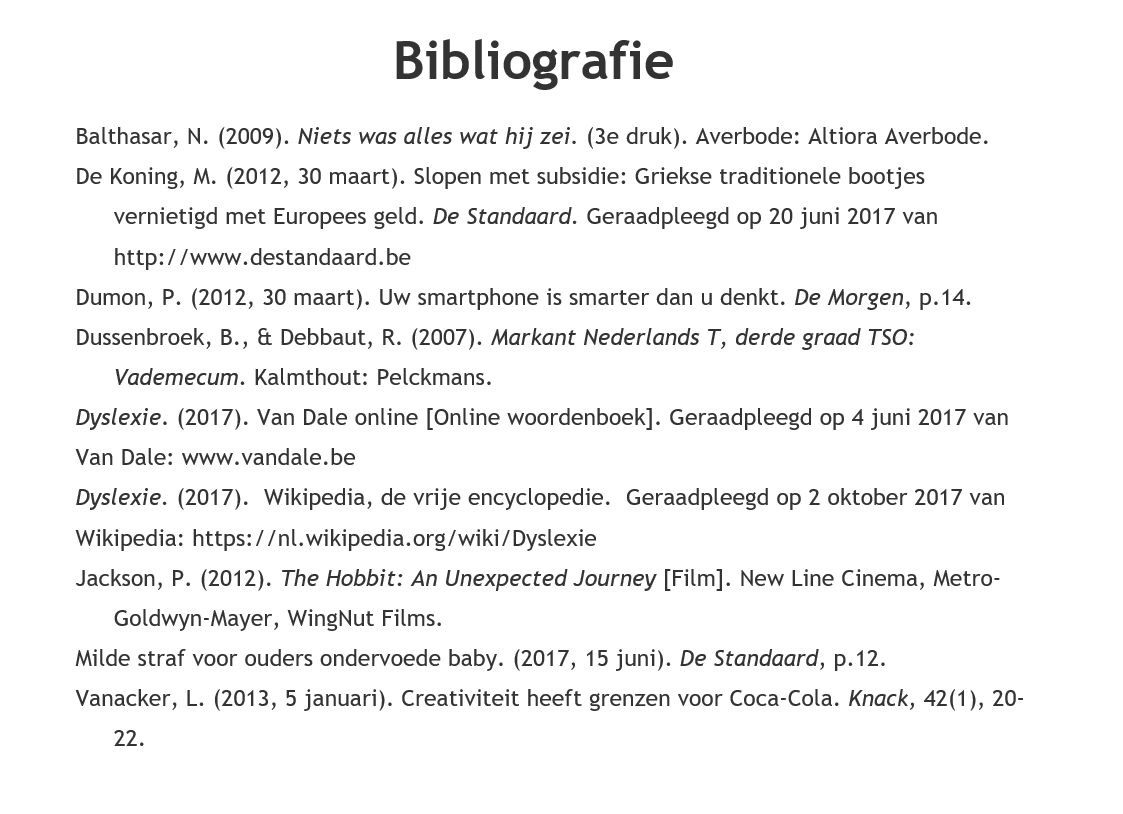 | Wikipedia-bijdragers. (2023, 5 januari). Dyslexie. Wikipedia, de vrije encyclopedie. Geraadpleegd op 10 januari 2023 van Wikipedia: https://nl.wikipedia.org/wiki/dyslexie | Groep van auteurs. (datum van laatste update). Titel of trefwoord van het artikel. Geraadpleegd op …. van url website. |