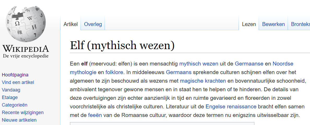 | Volgens Wikipedia (Wikipedia-bijdragers, 2022) komen elfen in Noord-Europese verhalen voor. Ze lijken wat op mensen, maar ze beschikken wel over vormen van magie. Wikipedia vermeldt ook dat ze een 'bovennatuurlijke schoonheid' zouden hebben. Mensen mochten zich echter niet aan die schoonheid laten vangen. Ze konden zowel vriendelijk als vijandelijk zijn, volgens dezelfde bron. | De informatie komt hier allemaal uit dezelfde bron, maar de gebruikte woorden en de zinsbouw zijn volledig anders. Dit is geen plagiaat meer. | |