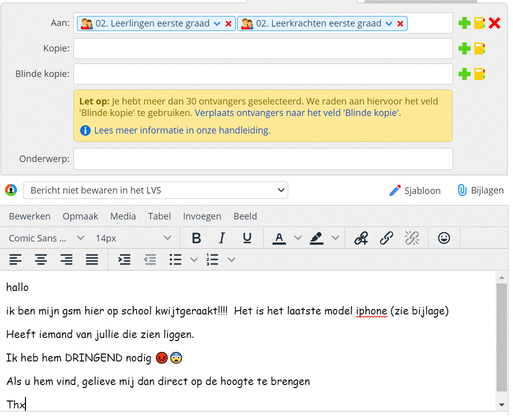 Fout ① Doelpubliek: Je mailt niet naar de hele school om te melden dat je je gsm kwijt bent. Schrijf enkel een mail naar degenen die je echt zouden kunnen helpen. Je krijgt van Smartschool gelukkig een melding dat je te veel ontvangers hebt geselecteerd. Fout ② Onderwerp: Verstuur je bericht niet zonder een (duidelijk) onderwerp. Fout ③ Aanspreking: Een aanspreking moet altijd met een hoofdletter beginnen. Een medeleerling mag je binnen Smartschool aanspreken met 'Dag ....'. Een volwassene spreek je aan met 'Beste mevrouw ...' of 'beste mijnheer ...'. 'Geachte' is een beetje verouderd. Na een aanspreking hoeft er geen leesteken. Je laat één witregel na de aanspreking. Fout ④ Hoofdletters: Ook je eerste zin (na de aanspreking) begint met een hoofdletter. Je gebruikt nooit hoofdletters als vorm van emotie. Dit staat gelijk aan schreeuwen. Fout ⑤ Leestekens: Gebruik geen uitroeptekens in je mail. Dat staat gelijk aan schreeuwen. Na een volzin moet een punt. Na een vraagzin ('Heeft iemand van jullie...') moet een vraagteken. Fout ⑥ Bijlage: Als je verwijst naar een bijlage, moet je wel een bijlage opnemen. Verstuur je mail niet te snel. Fout ⑦ Emoticons: Emoticons gebruik je enkel onder vrienden en op sociale media. Geen idee waarom Smartschool ze toelaat. Fout ⑧ Aanspreekvorm: Wissel niet telkens tussen 'u' en 'je'. Gebruik 'je' voor medeleerlingen en 'u' voor volwassenen. Fout ⑨ Spelfouten: Vermijd spelfouten ('... u hem vind...' = '...u hem vindt...'). Fout ⑩ Toon: Let op je toon in je mail. Deze mail klinkt heel opdringerig ('gelieve mij dan direct'...). Op deze manier zullen weinig mensen je willen helpen. Fout ⑪ Lettertype en lay-out: Gebruik standaardlettertypes als Verdana of Tahoma. Comic Sans MS is een lettertype dat je enkel gebruikt voor verjaardagsfeestjes of circusvoorstellingen. Groepeer je tekst in alinea's, maar overdrijf niet. Als je tekst heel kort is, hoeft niet elke regel een alinea te zijn. Fout ⑫ Afkortingen en groepstaal: Vermijd te veel afkortingen. Groepstaal zoals 'thx' is sowieso ongepast. Fout ⑬ Afsluiting: 'Thx' is een ongepaste afsluiting voor een mail. Een mail sluit je zo af: bedanking - witregel - groet - witregel - je naam en klas. Fout ⑭ Duidelijkheid en context: Het is niet duidelijk wanneer de verzender zijn gsm is kwijtgeraakt. Hij doet ook geen moeite om na te denken over de plaats waar de gsm zou kunnen liggen. Als de verzender geen moeite doet, zal de ontvanger ook geen moeite doen. |
